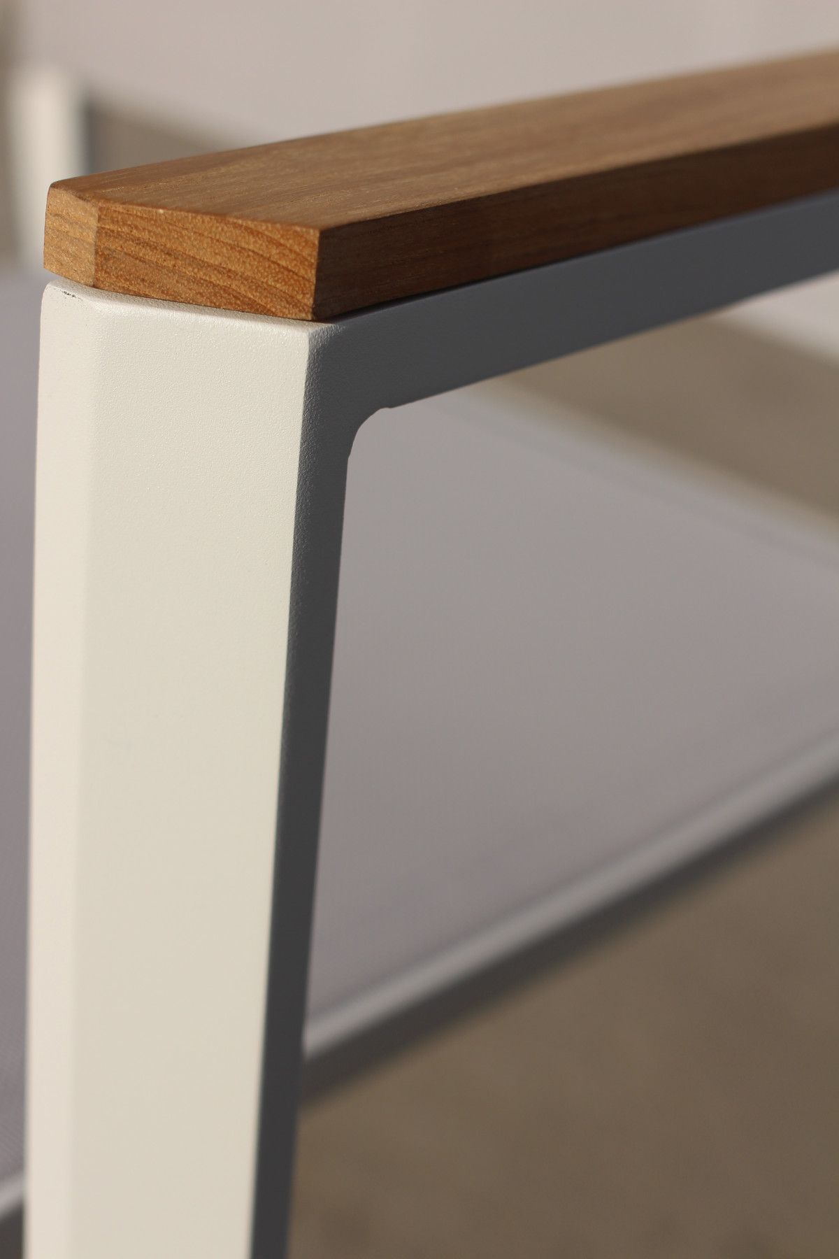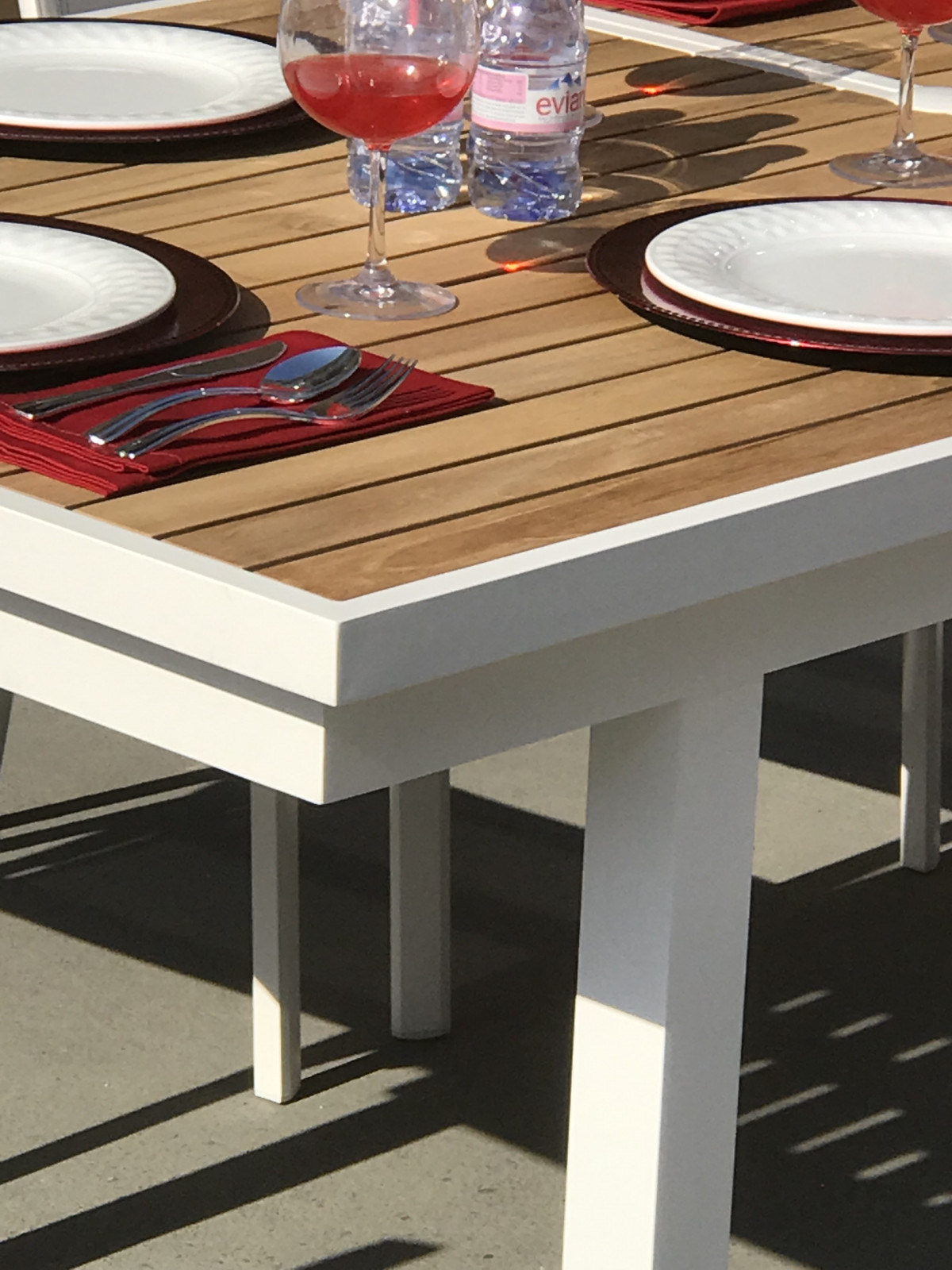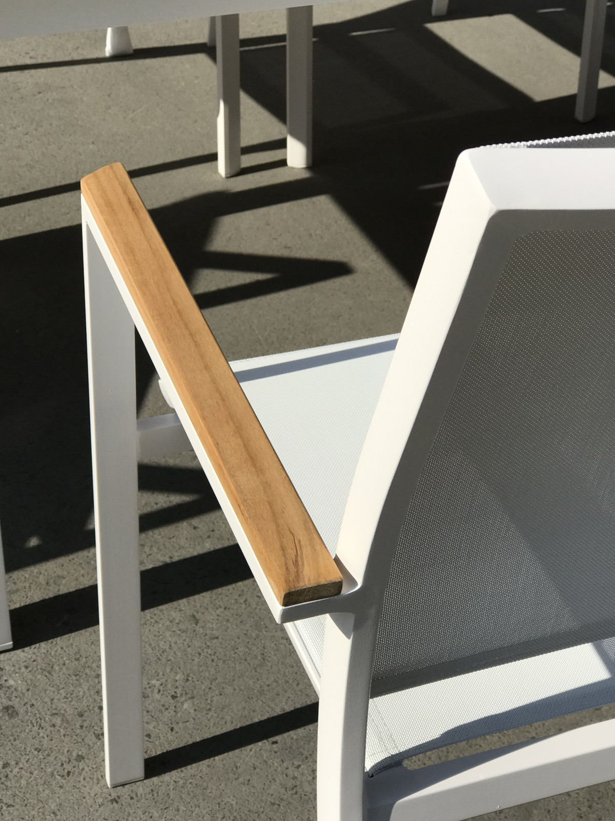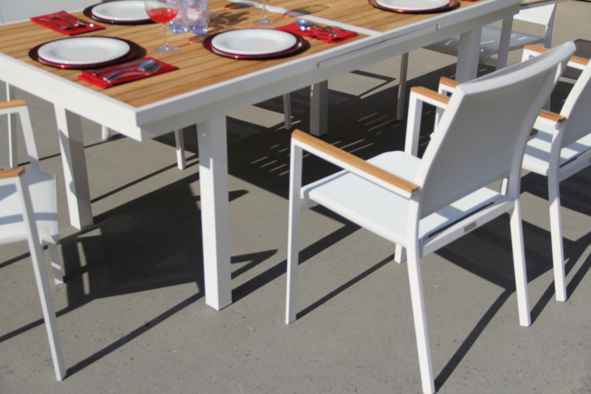 Essence dining white frame with white sling and Cosmopolitan teak extension table