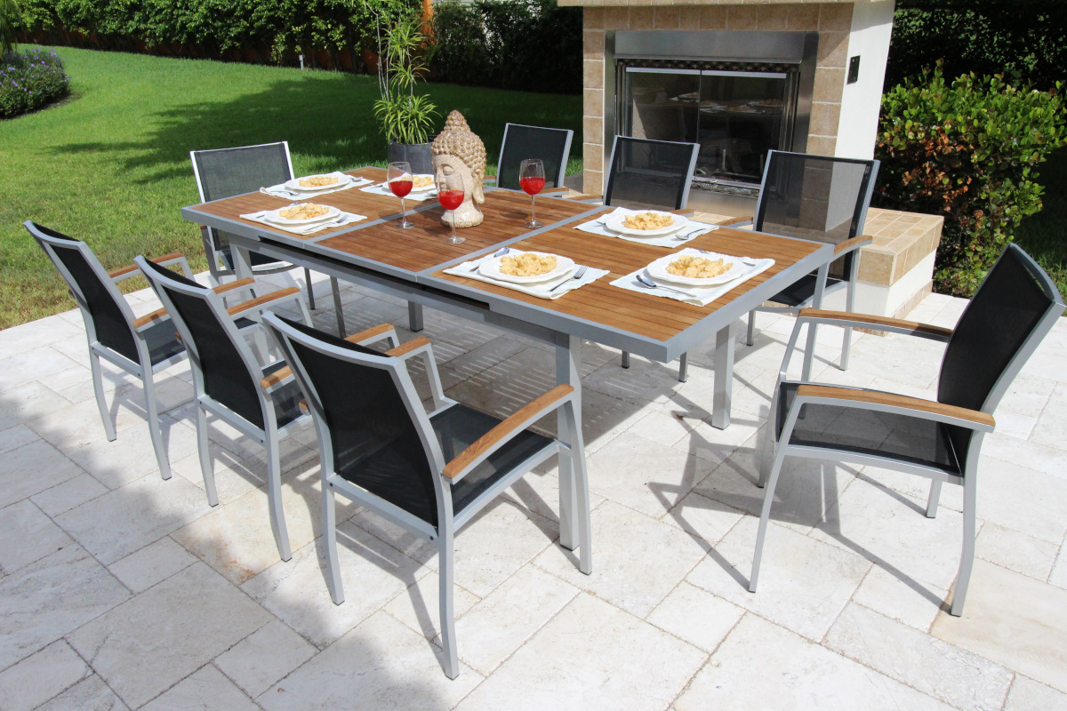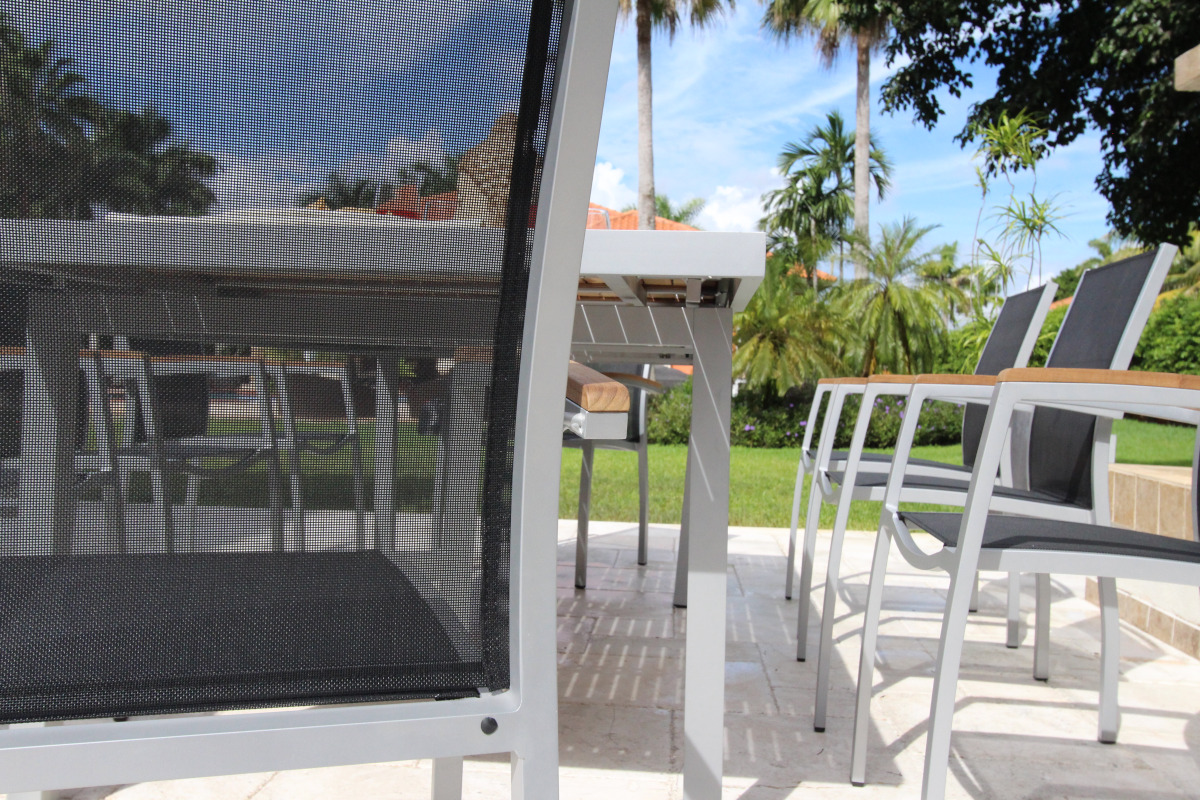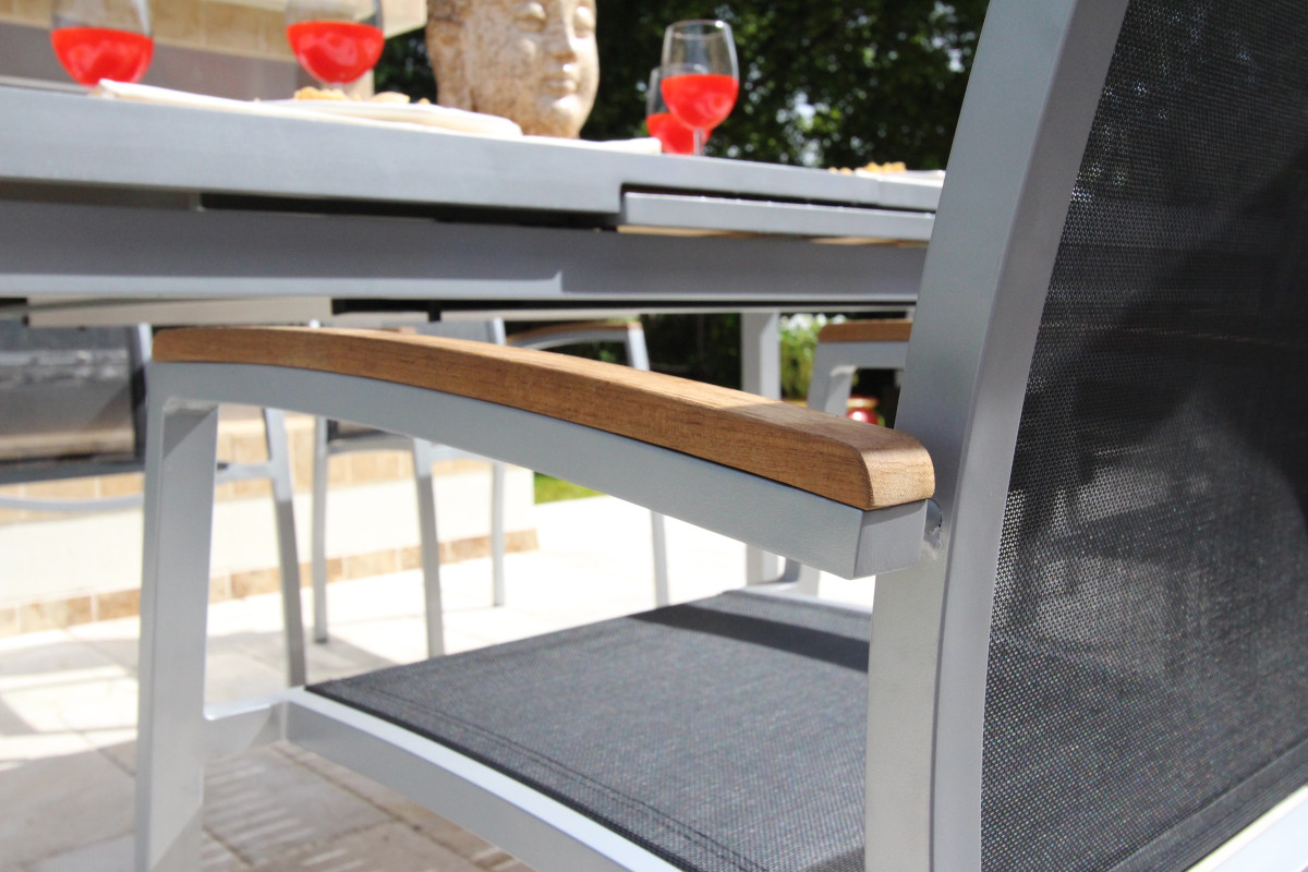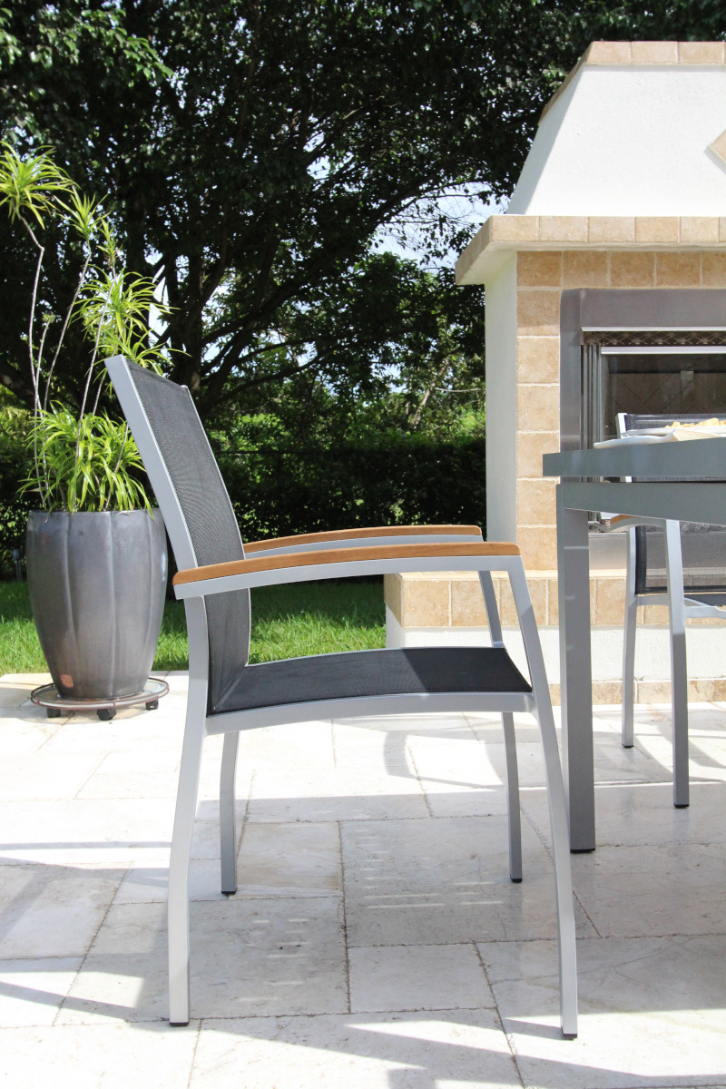 With a grey frame and sling seat combined with our teak table top, the Galliano dining set is unique in design that offers both visual impact and exceptional comfort. The sleek, powder-coated frame is made of 100% aluminum. The finish and streamlined design work well with a variety of outdoor décor. The premium-quality mesh sling is supportive yet giving and allows air to circulate to keep you cool.