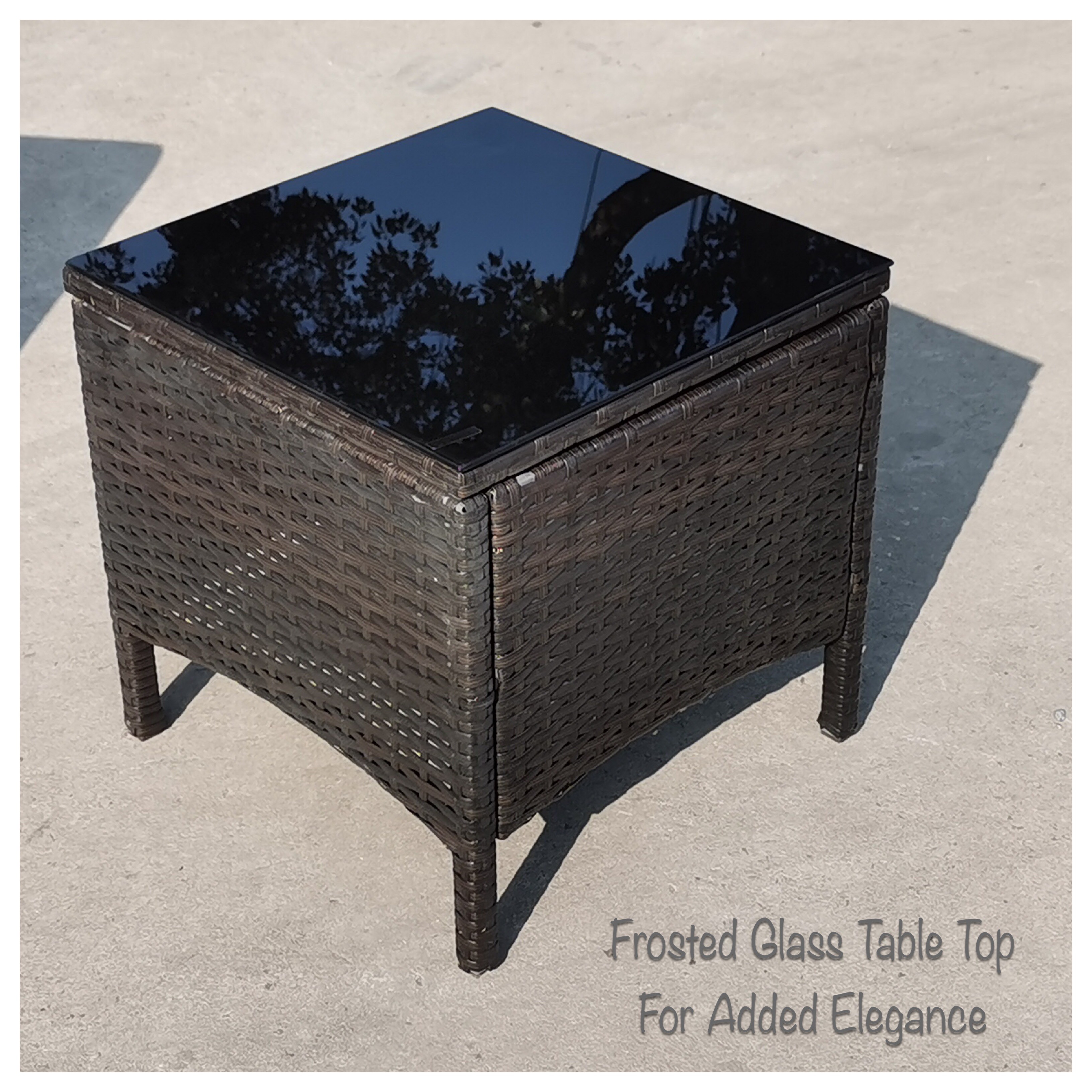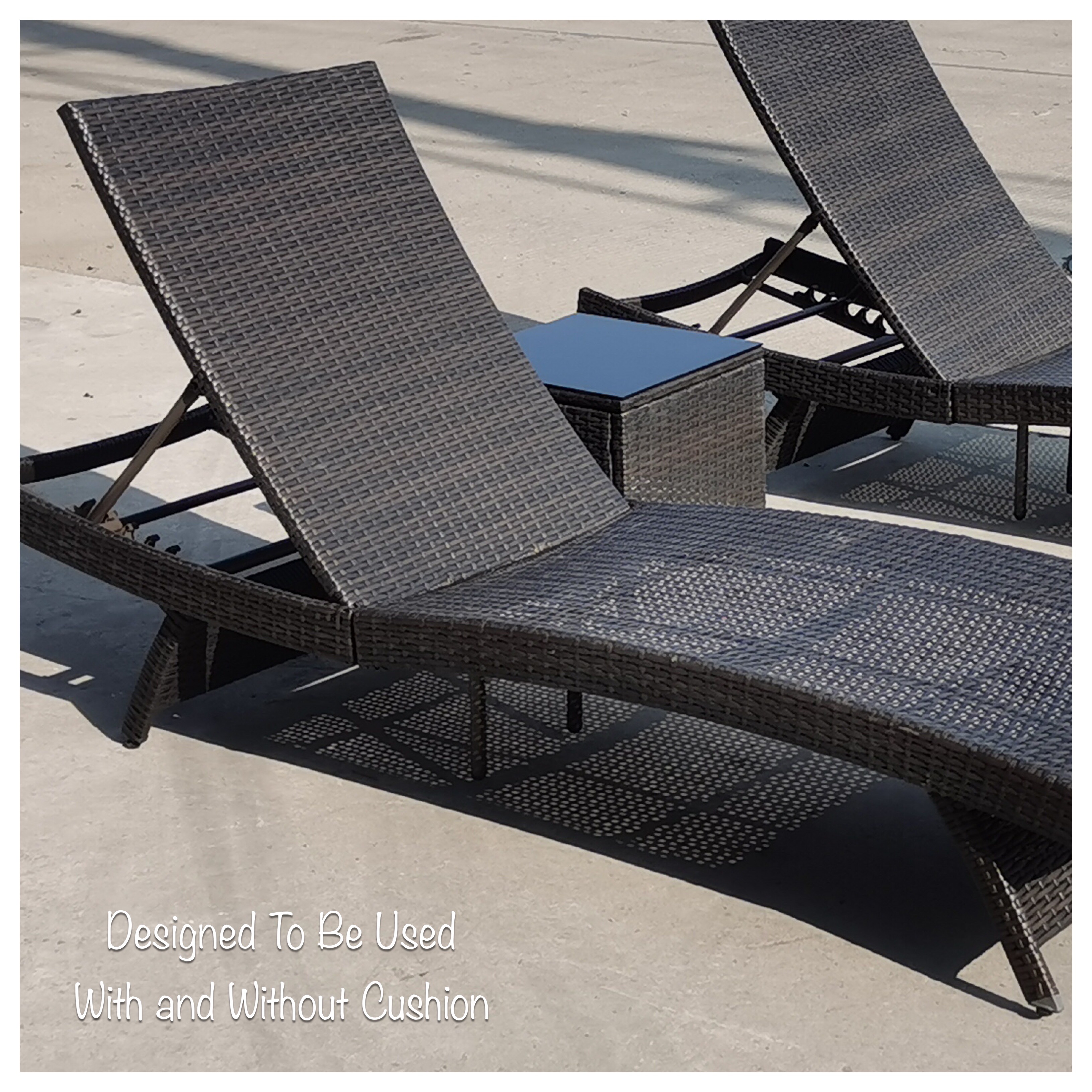 Generously sized chaise lounges with table allows you to soak up the sun in style and comfort. Crafted with reinforced steel frame and handwoven with resin wicker. The chaises feature five reclining positions (including fully flat), so you can easily find the most comfortable position. The chaises include all-weather cushions. Included with the chaise lounges is a side table with an elegant tempered frosted glass tabletop.
