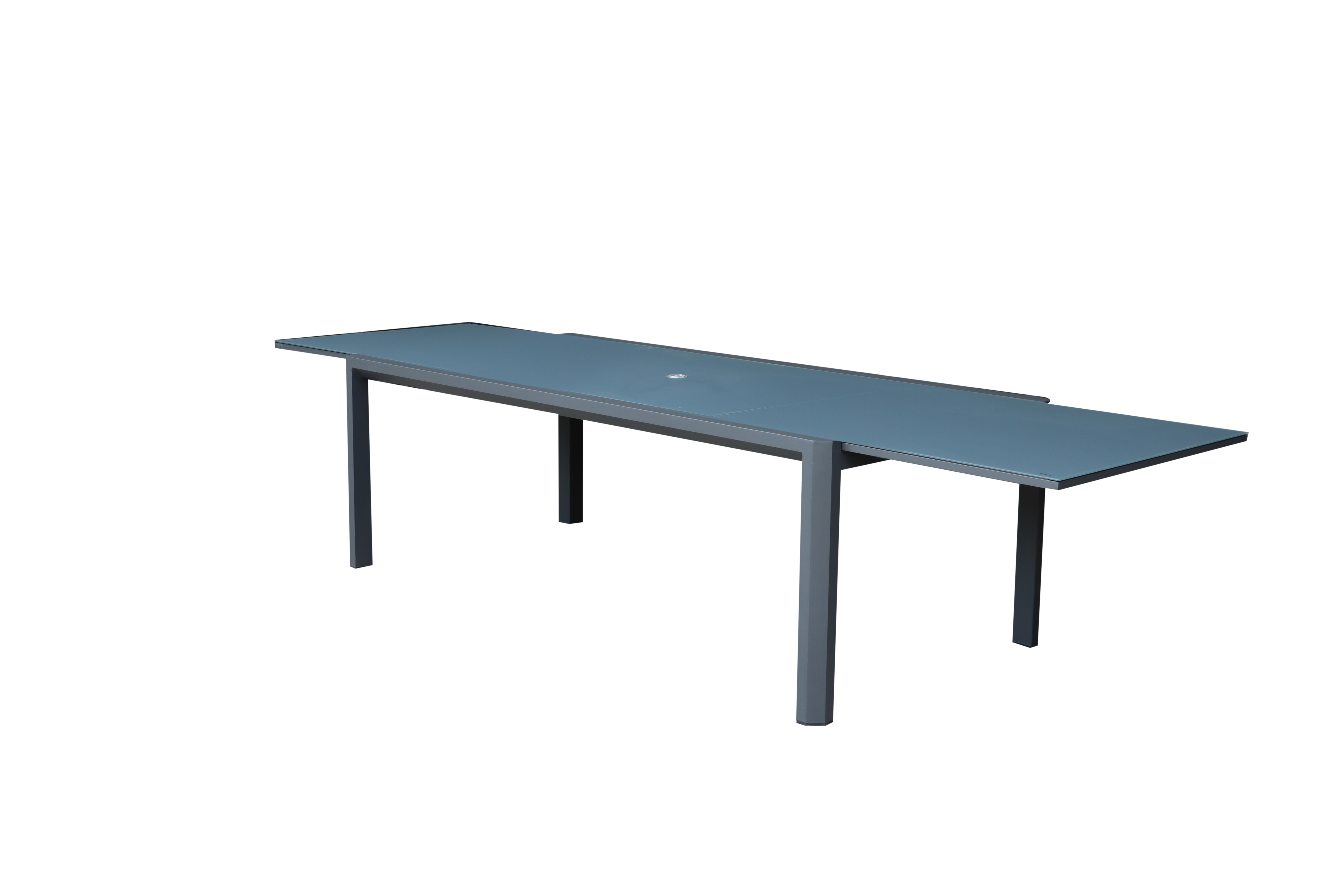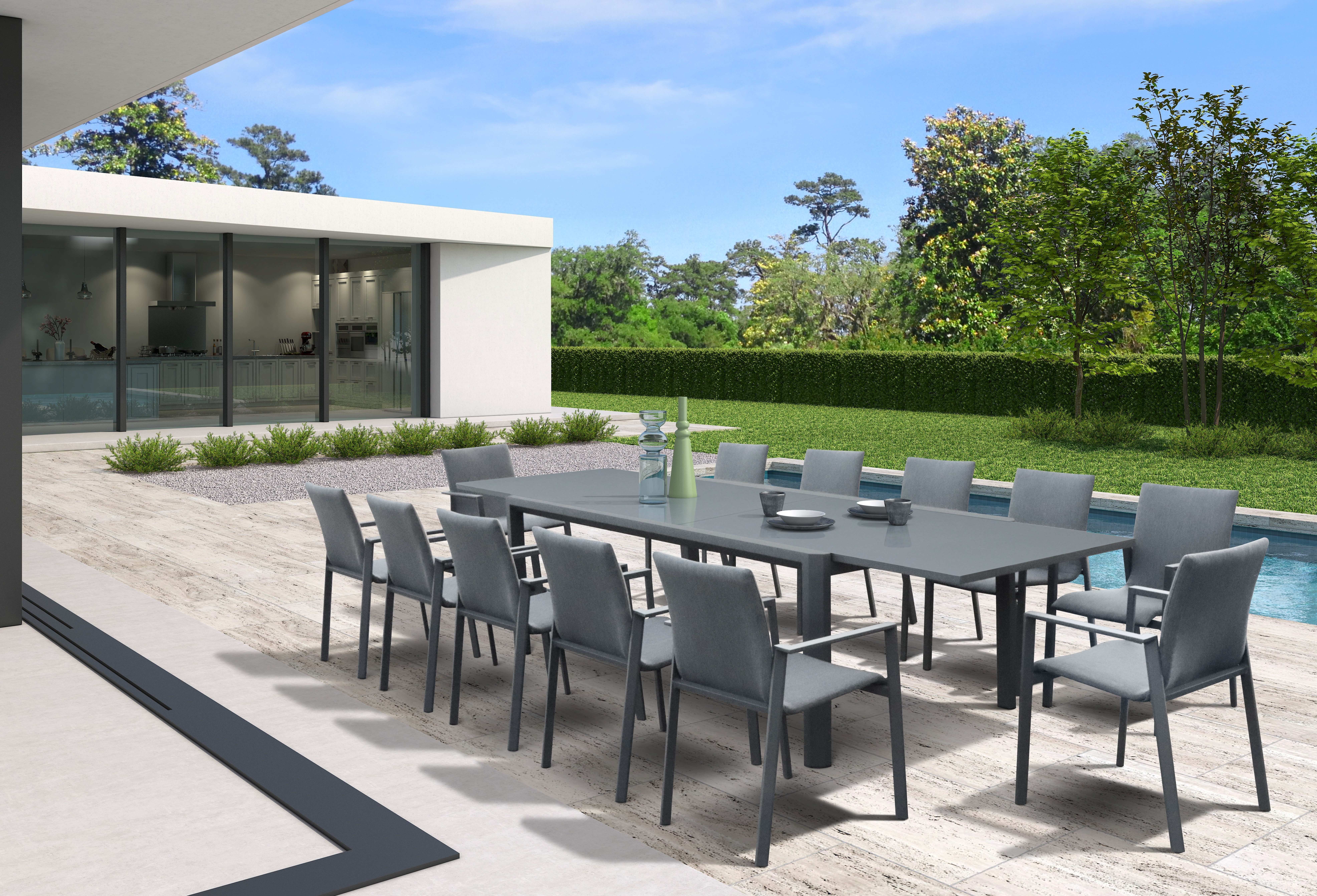 Transform your outdoor space into your personal oasis. Whether you want to create a tranquil retreat, or a place for entertainment, you will find everything you need right here with our Vicari dining set. The Vicari Collection is made using rust-resistant aluminum frames that feature striking angled supports and comfortable cushioned sling seating. The chair frames are 360° welded for strength and hand polished for a perfect finish. The frames are powder-coated with a durable UV- resistant finish in a Dark Grey tone to look beautiful from any angle and for long-lasting durability. Vicari dining offers comfort without the need for cushions. The dining chairs are upholstered with a grey cushioned olefin fabric. The all-weather fabric padded sling is colorfast and is UV-stabilized for resistance against fading. This equates to cushions that are easy to clean, long-lasting and extremely comfortable without the maintenance of a regular cushion. The tabletop is finished with European reinforced frosted glass. With this elegant dining set, the tabletop generates excitement as well as beauty. The extension dining table when closed is 41.5 in. W x 86.75 in. L and will sit 8 guests. When fully extended at a moment's notice, the table measures 136 in. L, with a striking table sitting up to 12 guests. Simply extend the table using our sliding mechanism which ensures easy opening and closing. Reliable and stable in both forms.